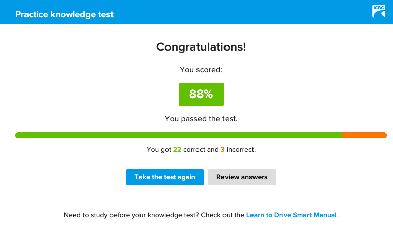 The ICBC website also offers online practice tests which are similar to the one I’ll take in person to obtain my learners permit. I have to achieve a minimum of 80% in order to pass. The tests are broken down in to practical questions and road signs.